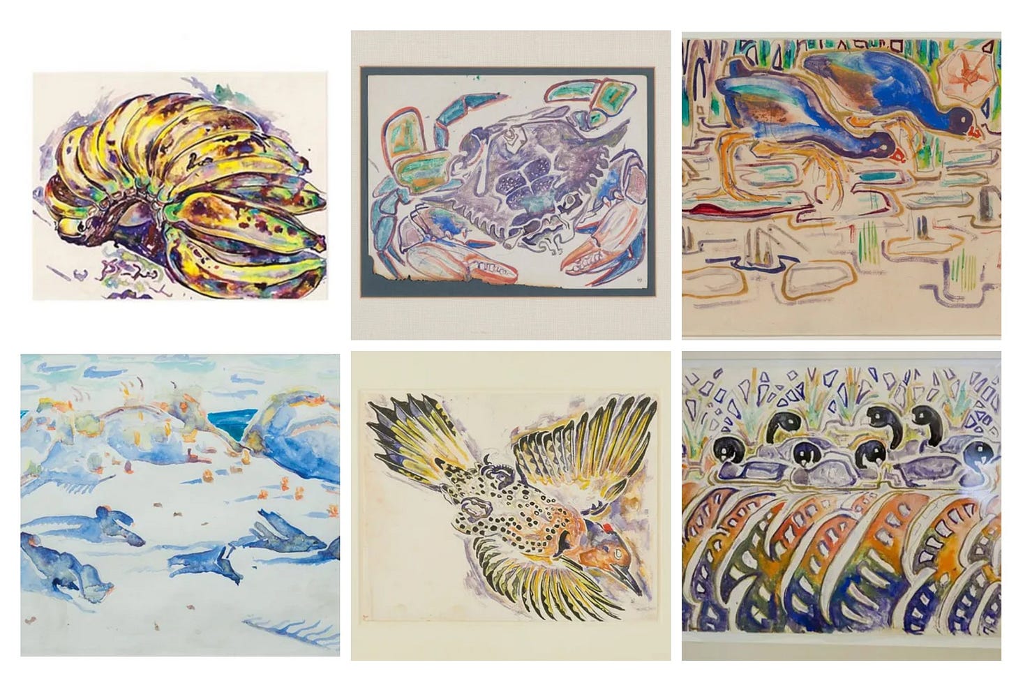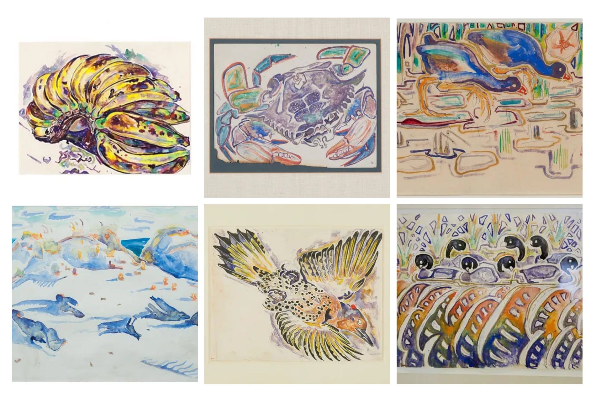 Working himself to exhaustion, Anderson created painting after painting on flapping sheets of typing paper — vibrant, frenetic, colorful beachscapes, waves, birdlife, sea creatures, vegetation, nothing escaped his artistic eye and flashing brush strokes — and then scrounge whatever food he could before crawling off to sleep under his overturned boat only to wake and do it all again for weeks at a time.