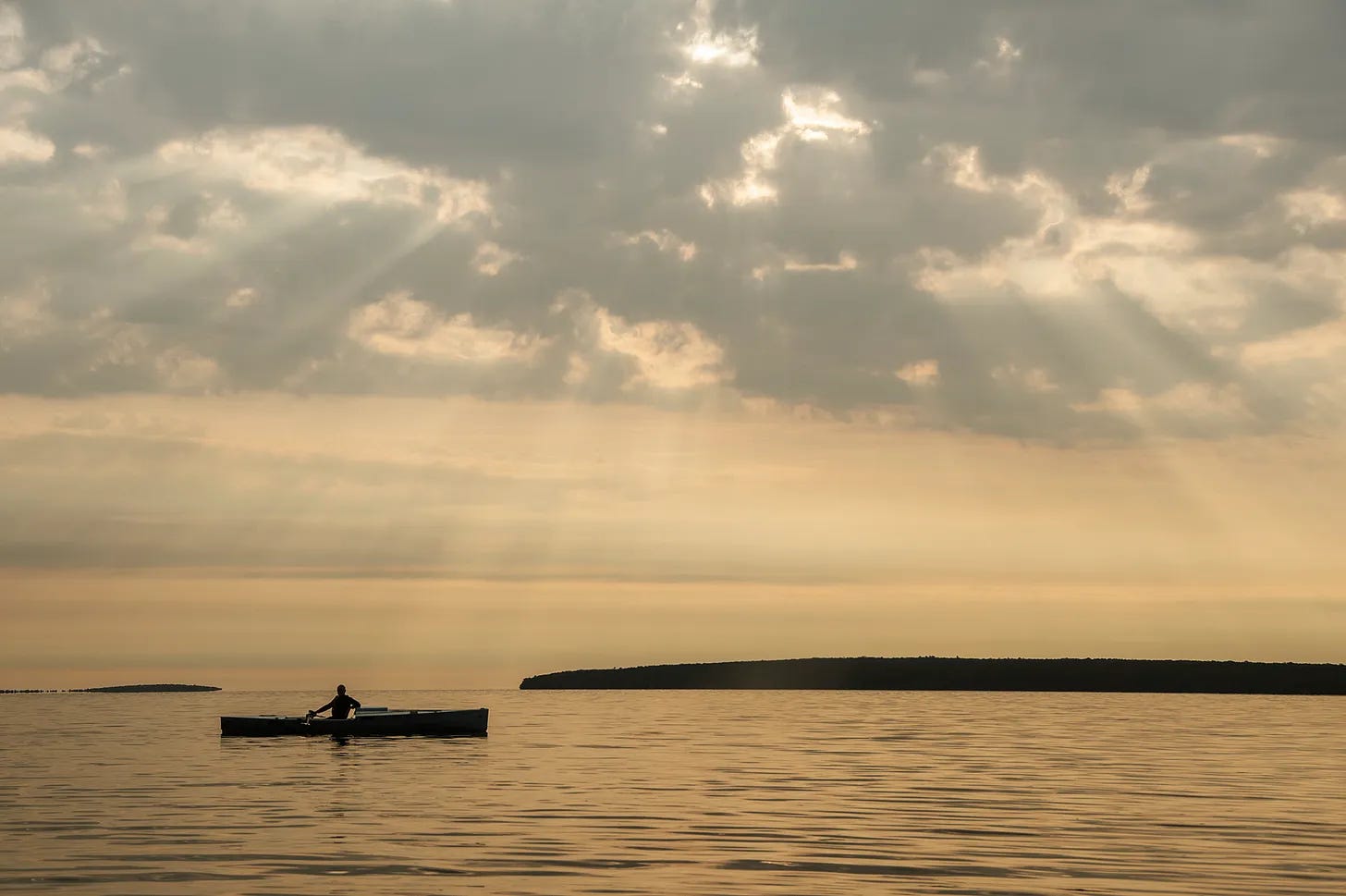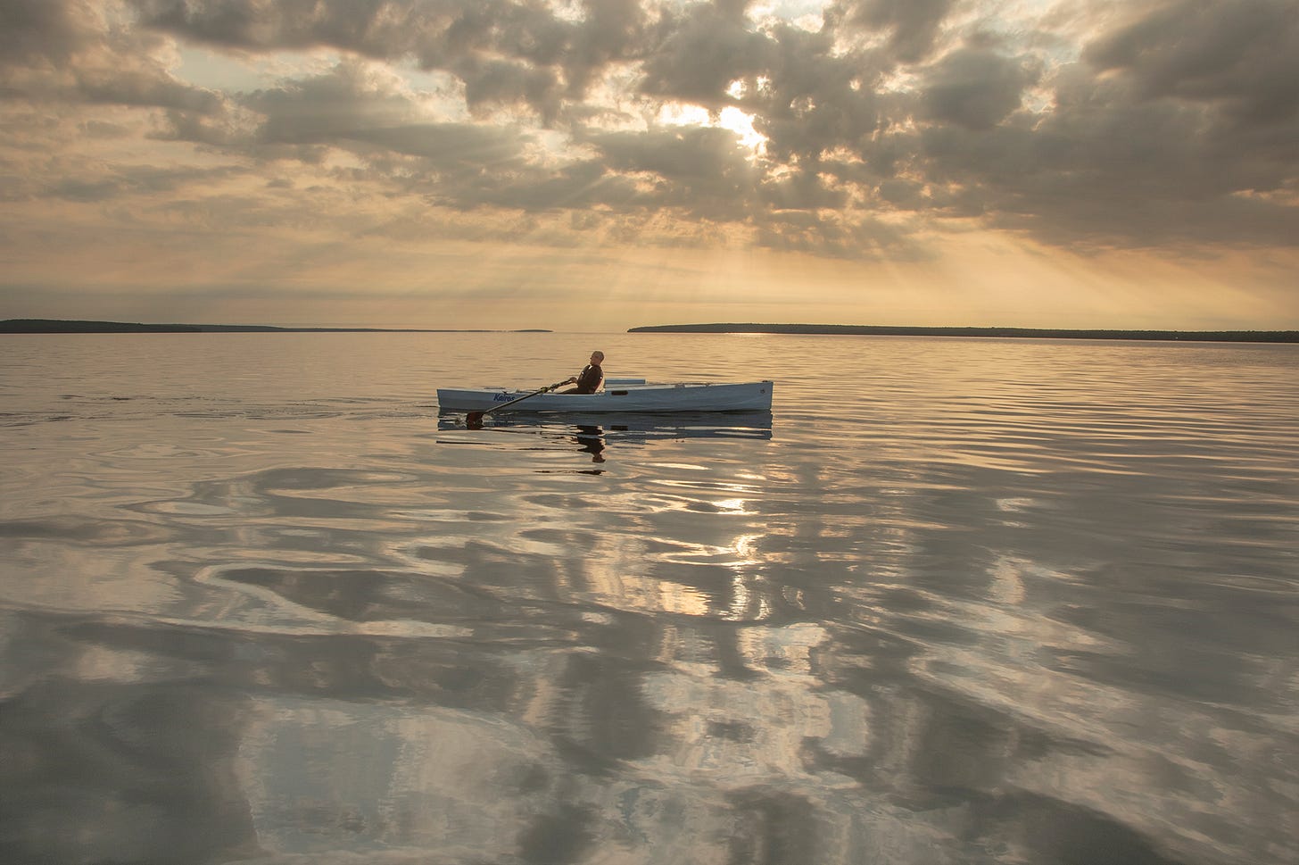 Straight off the bow of the Little Dipper, silhouetted against the sun just now pillaring through the clouds up the North Channel: a rowboat, the cadence of the oars flashing like wingbeats. I throttle back, both to slacken my wake out of respect for the rower, a friend of mine who shares my love of island mornings on the water, and because my mind is somewhere else, far away on a tiny speck of an island in the Mississippi Gulf. In the silhouette of the boat ahead floats the image of another rowboat, another artist, and a question that has helped shape the origins of my own search for a sense of place among these islands.