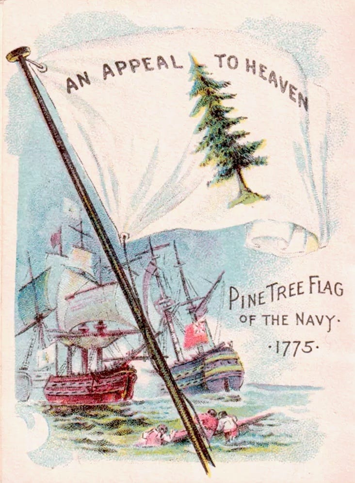 Before the Boston Tea Party, before the Declaration of Independence, American settlers were angered by the British government for their habit of claiming all the largest and best white pines, emblazoning them with a mark known as “the King’s Broad Arrow” claiming them for use in making the masts for the tall English war ships. It so angered the Americans that, although few history books remember it today, one of the very first flags of our Revolutionary War bore the symbol of a white pine as its crest.