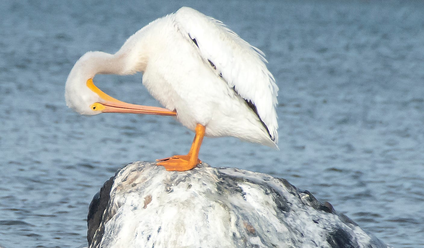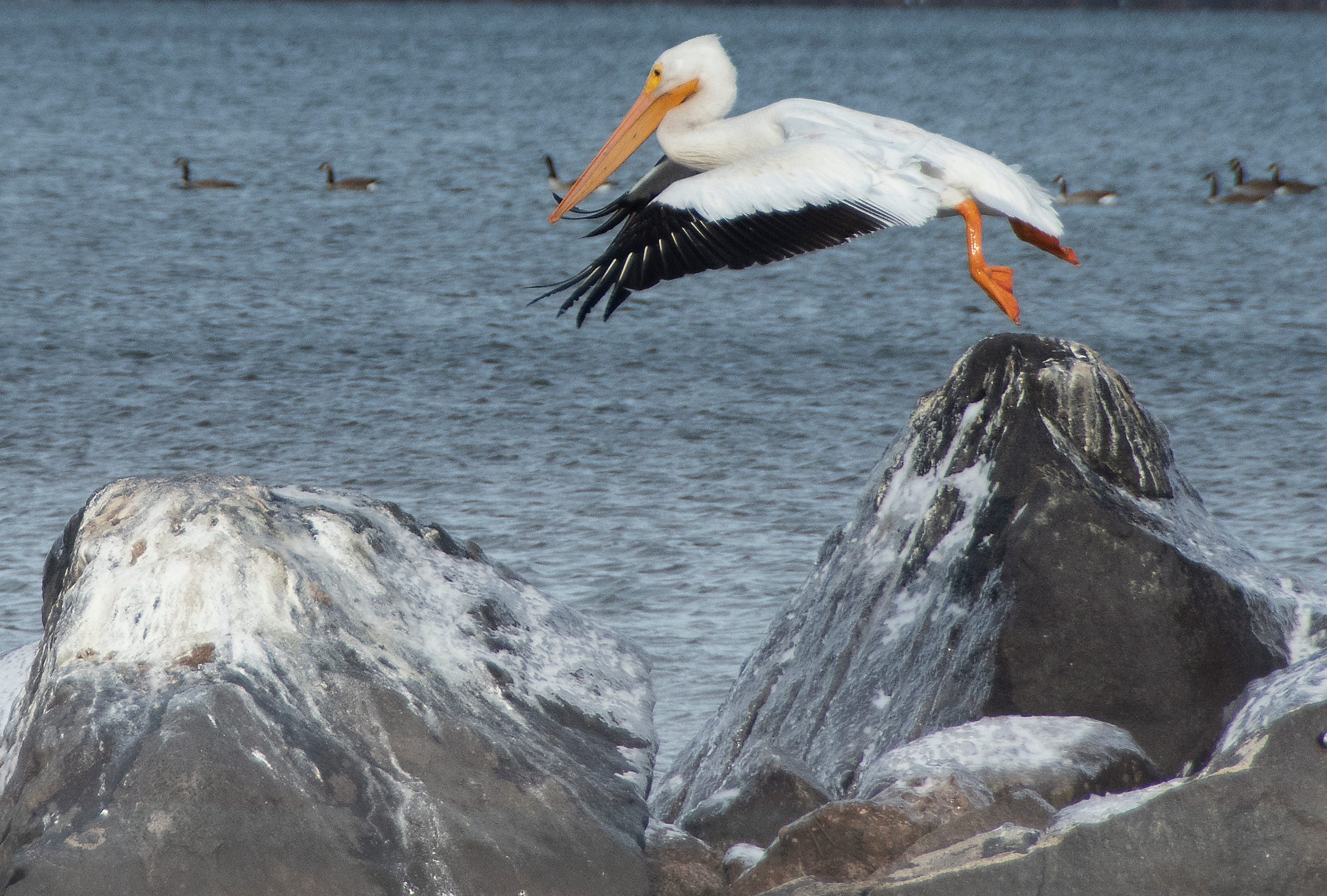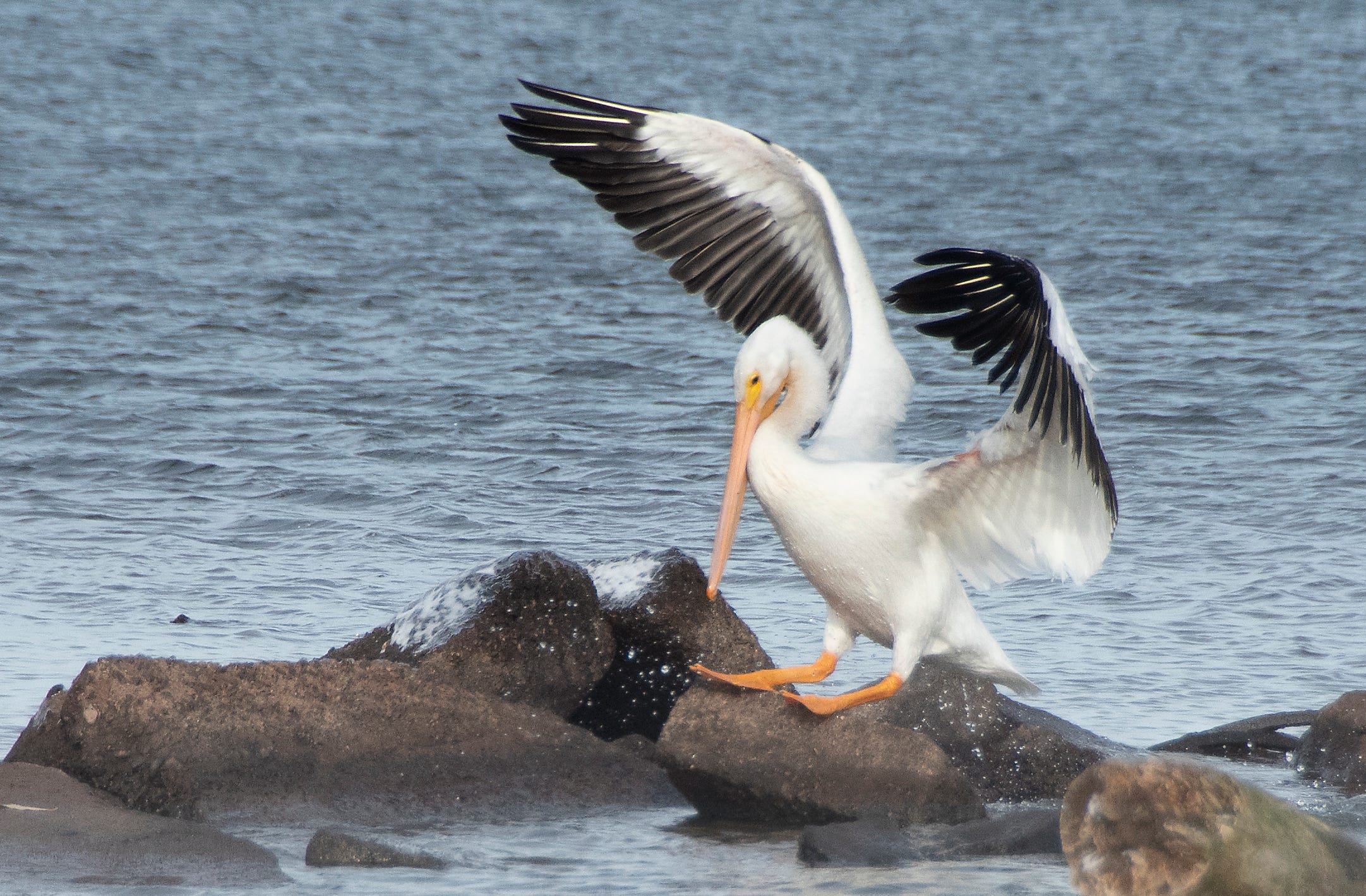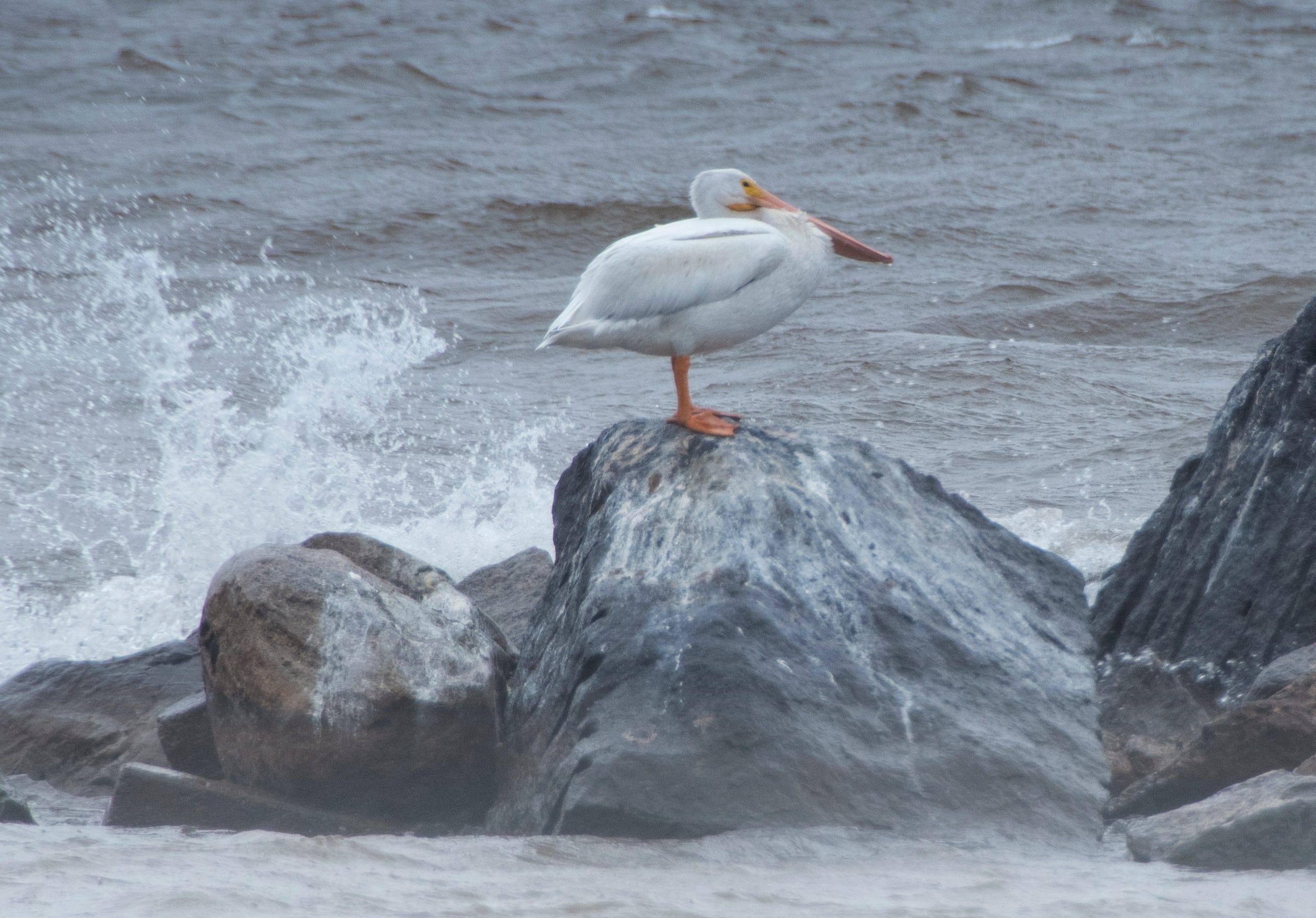 The bird was easily noticeable for several reasons, not least of which is that American White Pelicans are massive birds with a 9–10-foot wingspan and weigh around 15-20 lbs. These facts make them larger than bald eagles and give them a wider wingspan than California Condors! They are the largest flying birds in the U.S.! Another reason this pelican stood out in Ashland, WI, was its pure white plumage, which sharply contrasted with the backdrop of Lake Superior and the rocky shoreline. It didn’t help its anonymity when this individual frequently visited the popular beach area, just like human visitors to Ashland do.